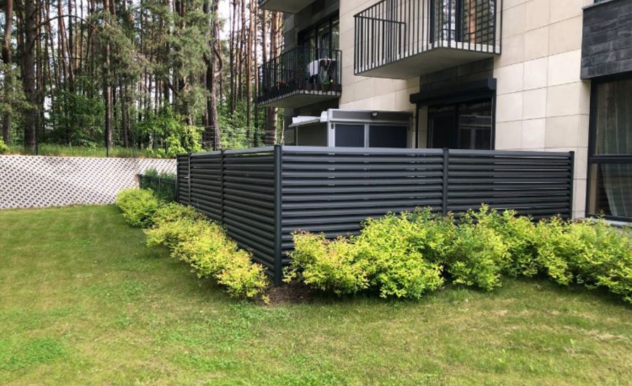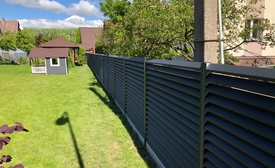 Gyvenamąjam namui aptverti buvo pasirinka medinė horizontalių tvoralenčių tvora su dekoratyviais metaliniai elementais. Prie tvoros dizaino priderinti automatozuoti vartai ir varteliai. Šiuolaikiniuose kiemuose vis daržniau naudojami automatizuoti vartai, jie ne tik suteikia modernumo kiemui, tačiau yra patogūs ir saugūs naudoti. Vartų dizainą galima derinti pagal kliento poreikius.